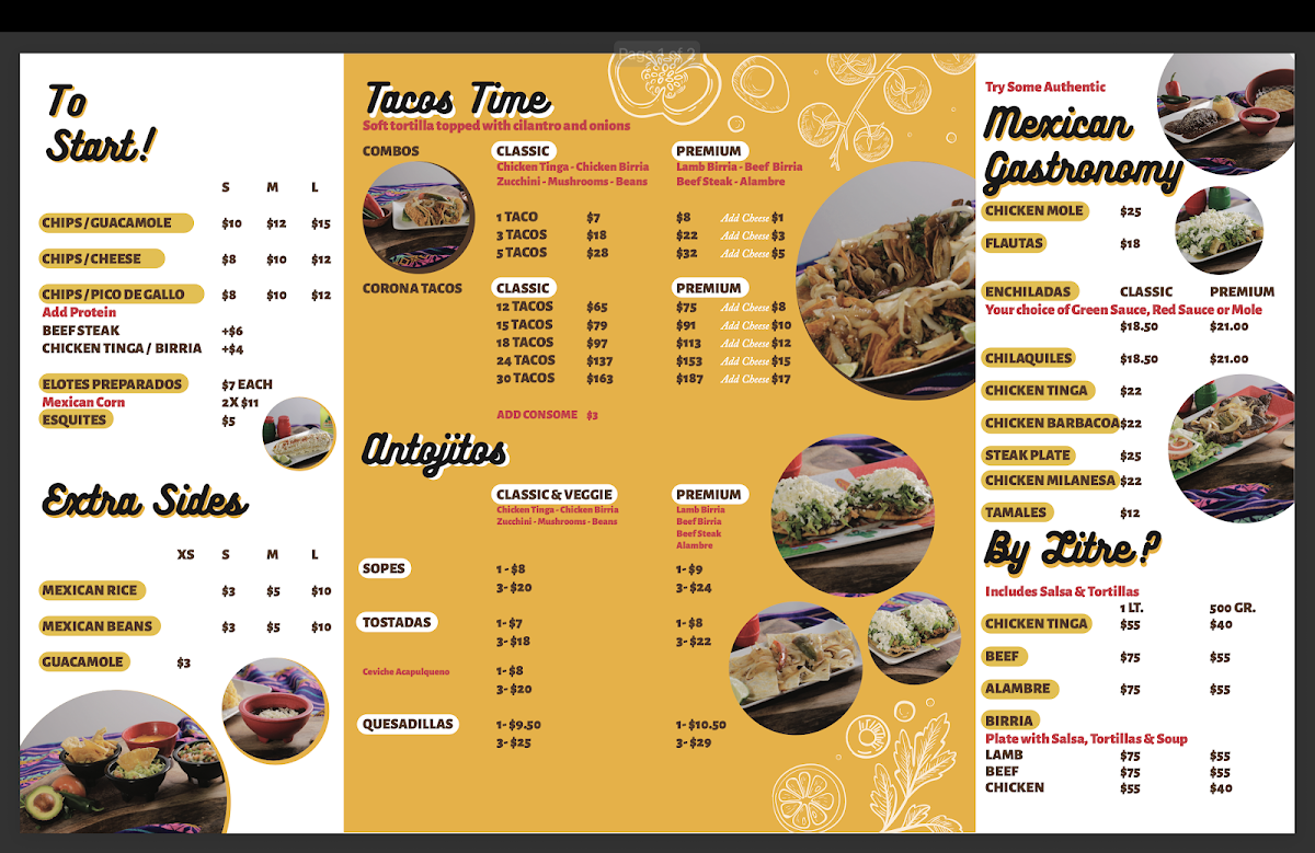 Dishes such as tacos al pastor, beef birria tacos, and quesadillas invite you to enjoy rich, flavorful meals often accompanied by sides like rice and beans or fresh guacamole with chips. Sweet treats like filled churros and pan dulce provide a gentle finish, while refreshing drinks like Jarritos glass-bottled Mexican sodas complement the food and add a nice touch of nostalgia.